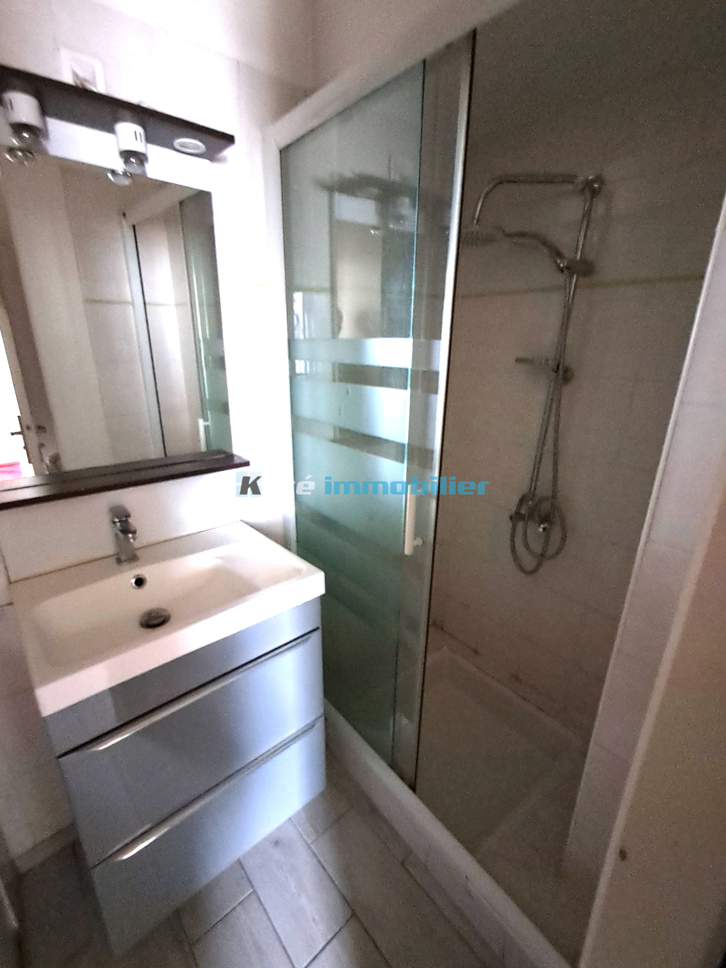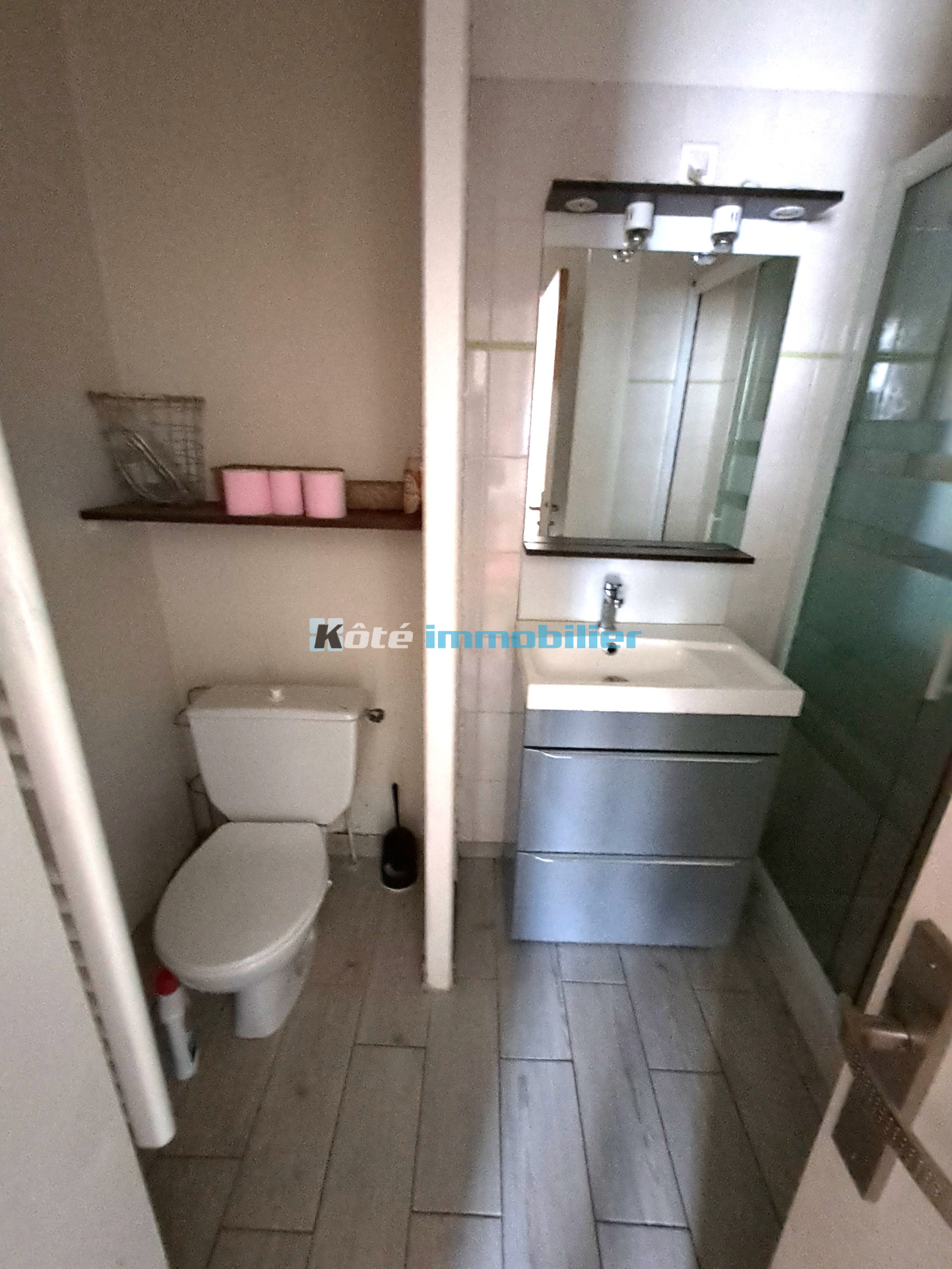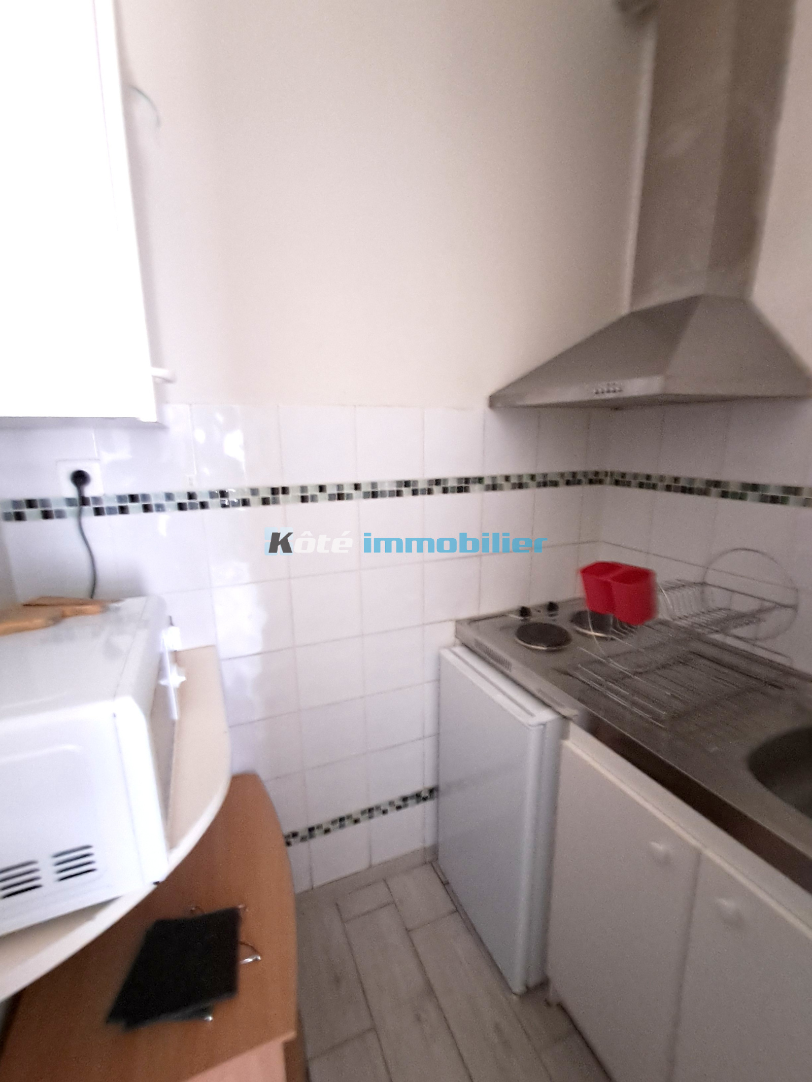 1 kitchennette équipée et un recoin avec 1 machine à laver. 1 salle d'eau avec meuble de rangement et 1 WC.
