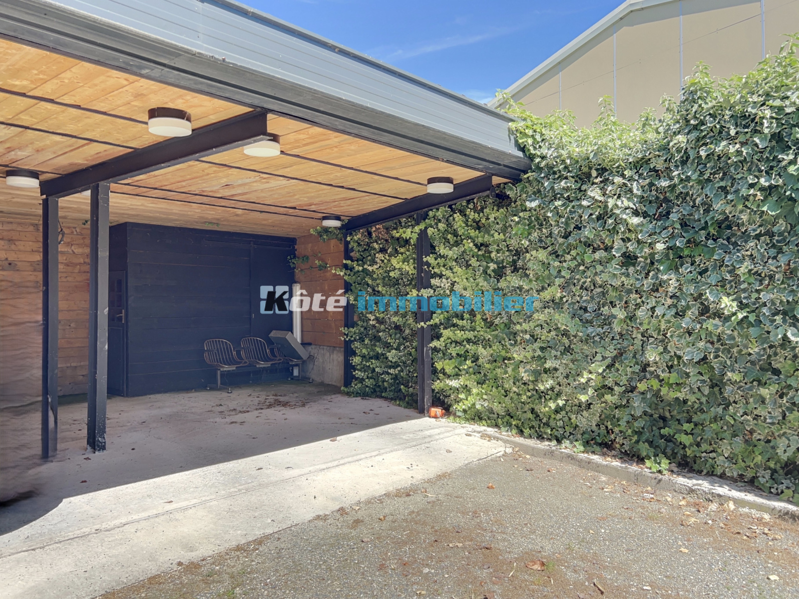 Un garage avec un espace en étage comprenant une pièce et une salle d'eau.
